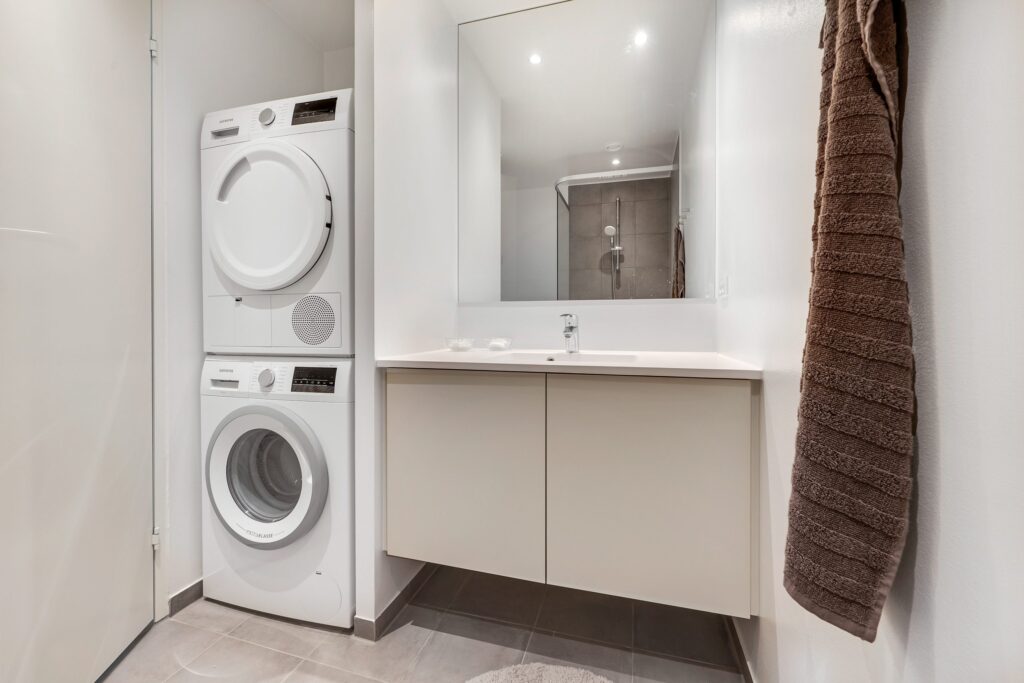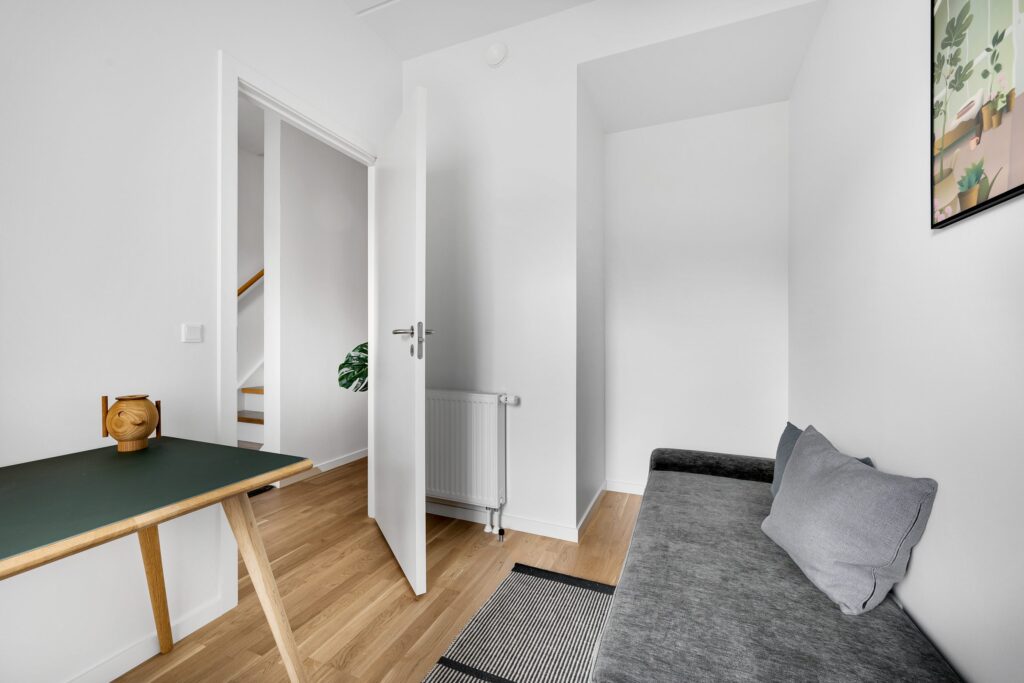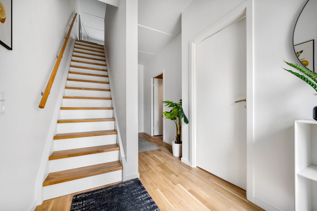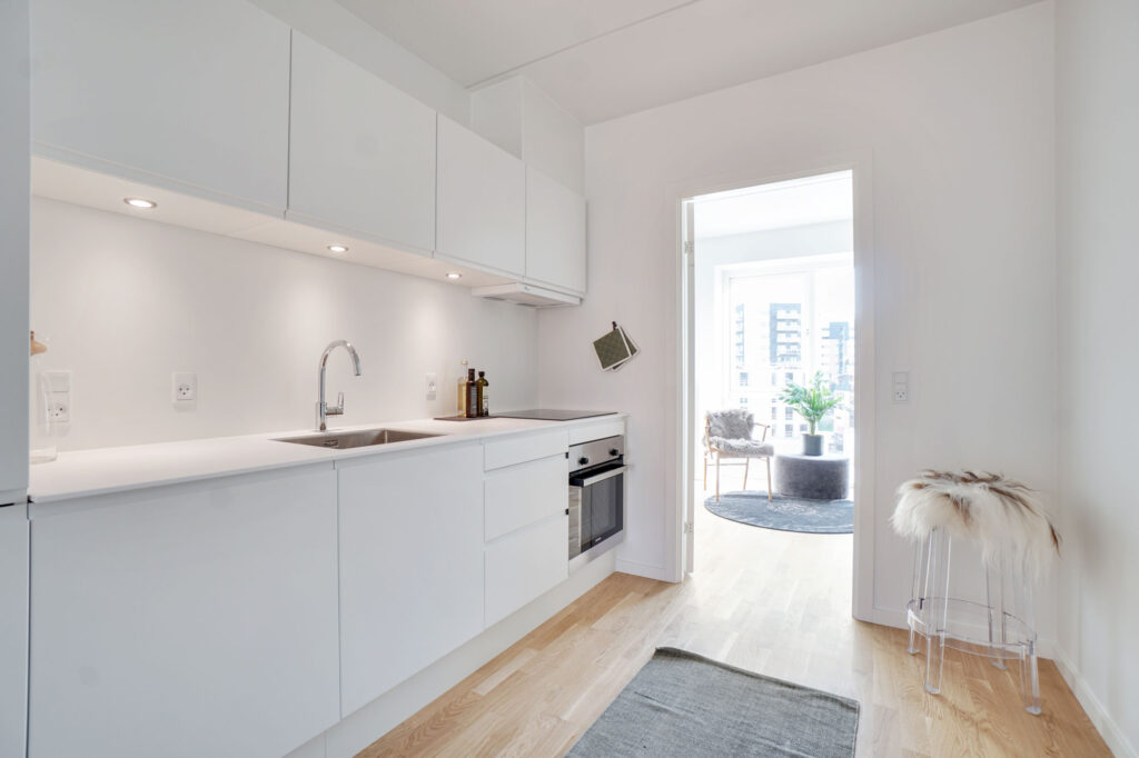 Glæd dig til hårde hvidevarer som opvaskemaskine, vaskemaskine og tørretumbler fra Simens, et stilrent køkken fra Designa med Dupont Corian bordplade og flotte, lyse lamelparketgulve i egetræ. Detaljer, som giver et moderne, eksklusivt og nordisk udtryk til boligerne – og som gør det nemt at sætte dit eget personlige præg på indretningen.